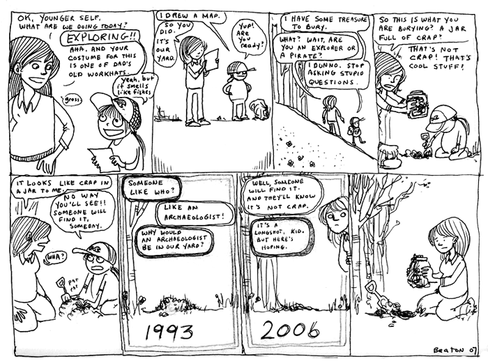 It had, I recall many years later, some jenga blocks, third place ribbons from Activity Day at school, drawings I made, pine needles, 'perfume' I made by sticking flowers in water in a little bottle (this is how I thought perfume was made), hair clips and some other things.